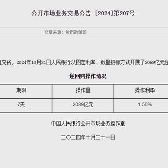 【#央行开展2089亿元7天期逆回购#】#今日央行公开市场操作#为维护银行体系流动性合理充裕配市值股票,2024年10月21日人民银行以固定利率、数量招标方式开展了2089亿元7天期逆回购操作,操作利率为1.50%。今日有427亿元7天期逆回购到期,实现净投放1662亿元。